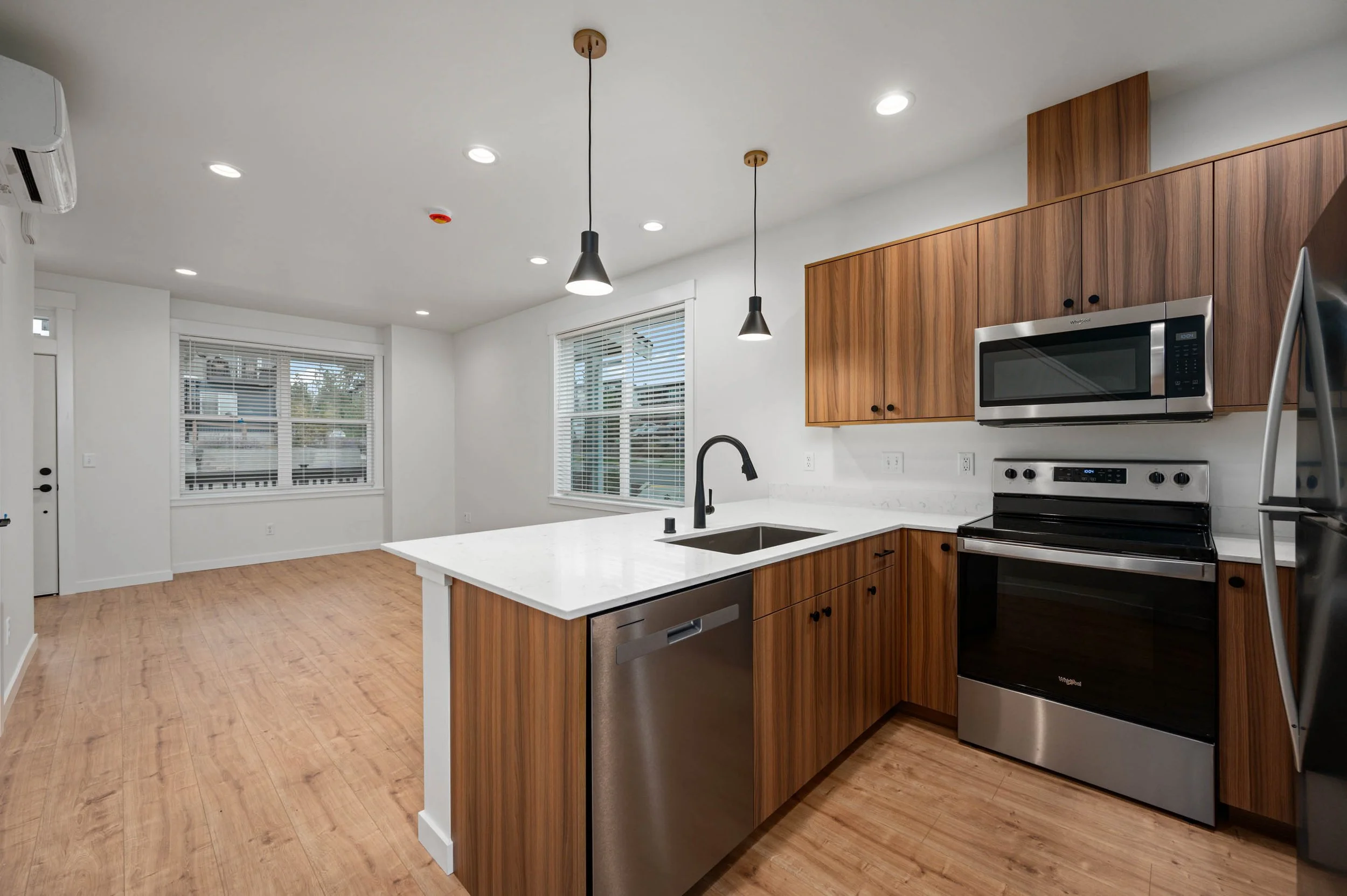Standardized kitchens across all homes feature durable cabinetry, quartz surfaces, and full appliance packages—selected to balance everyday usability with long-term performance.